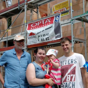 Nur wenige Wochen nach der offiziellen Grundsteinlegung konnten Daniel, Yvonne und Töchterchen Johanna Wich im Kreis von Familie und Freunden Richtfest für ihr künftiges Wohnhaus feiern, das wir in Massivbauweise in Haig errichten.